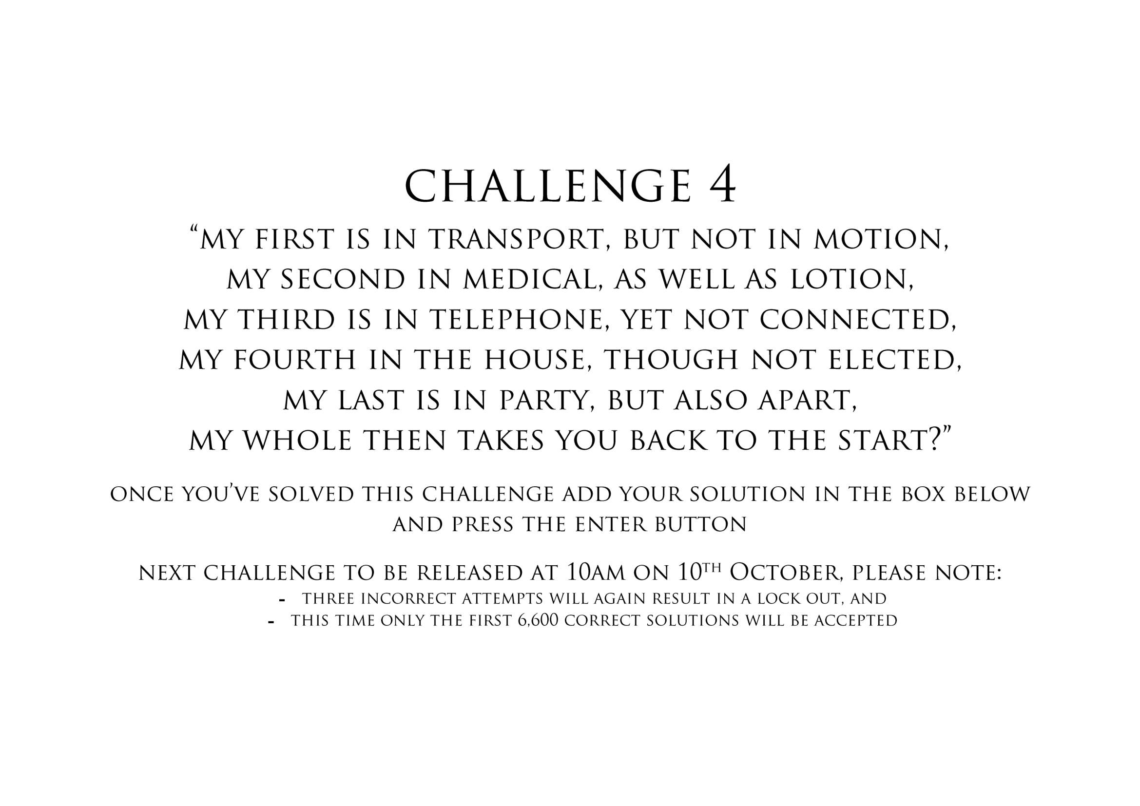 - The number of correct solutions accepted had dropped from the first (or should that be the second) ‘Challenge’, down to 6,600. Some quick mental arithmetic detected an upside here, roughly 85% of the remaining ‘Challengers’ could get through today, compared to just a third of the registered population from the initial clue, and